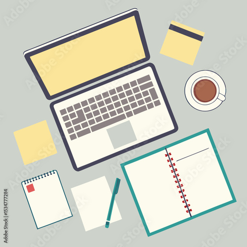 Flat lay of laptop workspace with coffee and notepad