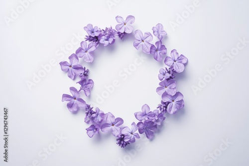 flat lay of lavender flowers arranged in the shape of an octagon on a white background, creating a soft and dreamy atmosphere for designs or text. Copy space in the center
