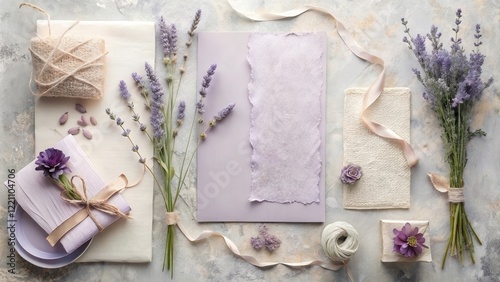 Flat lay of lavender sprigs, twine, and purple gift boxes with a blank card