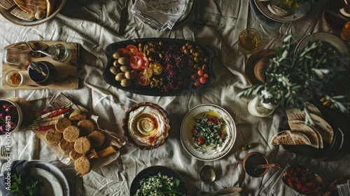 Flat lay of Mediterranean mezze platter, hummus, falafel, olives, tabbouleh, pita slices, warm tones on textured linen