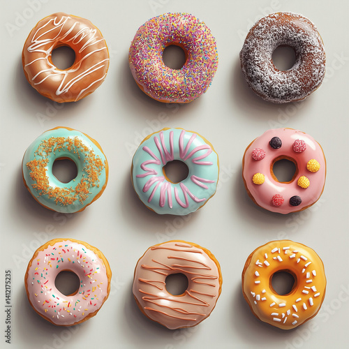 Flat lay of nine colorful donuts with various glazes and toppings on a soft background. A playful and clean food composition perfect for packaging, bakery branding, menu design, or food-related conten