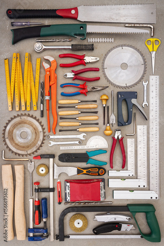 Flat lay of old hand tools on concrete background. Large collection of various rusty tools and bits arranged on concrete.