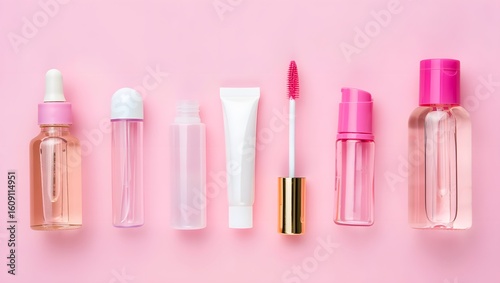 Flat lay of skincare products beauty products pink background cosmetic product photography
