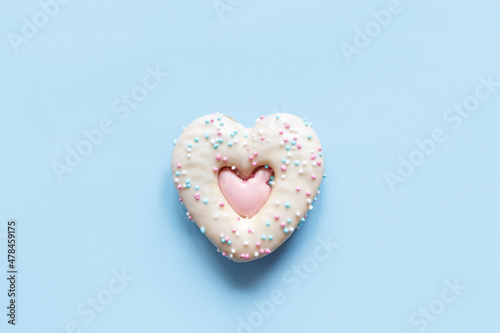 Flat lay of two heart shaped gingerbread cookies with sprinkles and icing on light blue background