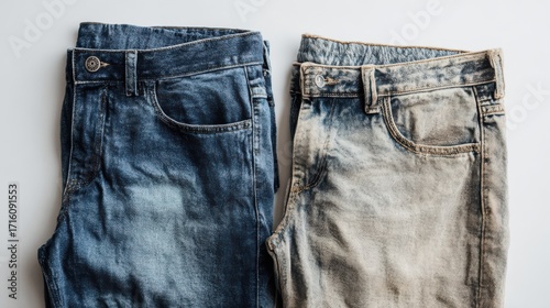 Flat lay of two pairs of long jeans, one dark blue and one light washed, side by side on a plain white background