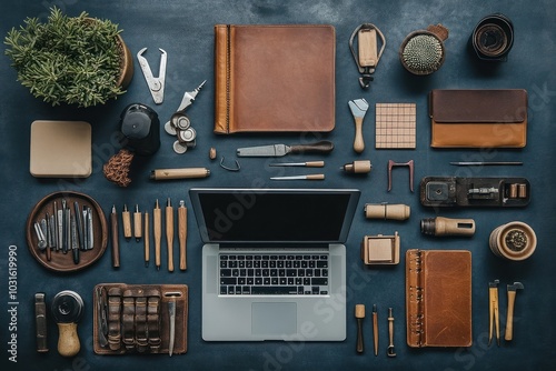 Flat lay of various tools and leather goods on a blue background.