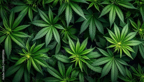 Flat lay of vibrant green cannabis leaves with serrated edges and radial symmetry, creating a textured botanical pattern