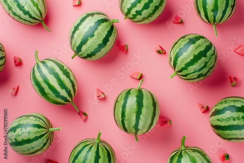 flat lay of watermelons arranged in an artistic pattern on a pink background, creating a vibrant and refreshing summer concept