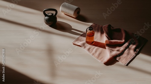 Flat lay of yoga essentials, top-view minimalist workout gear arrangement.