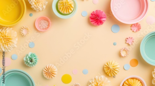 Flat lay on a light background with simple childish decorations and empty space in the center.