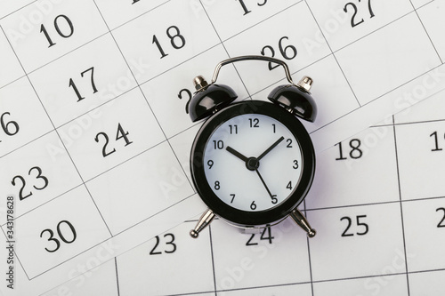 Flat lay or top view of black alarm clock with white calendar on wooden board with copy space, schedule for vacation, reminder for business appointment