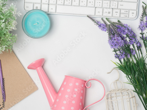 Flat lay, top view office table desk frame. feminine desk workspace with laptop, watch on white background.Love concept top view composition.note for something in love emotion.