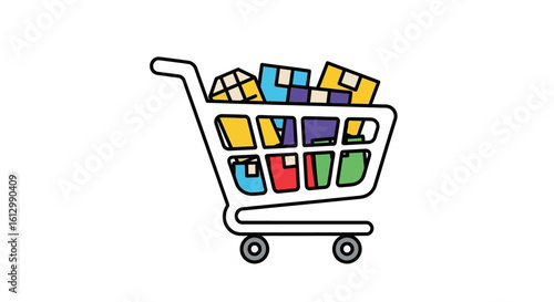 Flat line illustration of a shopping cart full of colorful gift boxes. Concept for retail, consumerism, and a successful shopping spree.