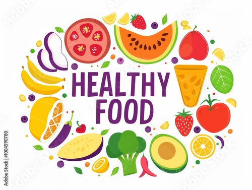 flat logo of healthy food featuring the text "HEALTHY FOOD" on a white background. The design utilizes bright colors to represent a variety of nutritious foods, promoting wellness and healthy eating