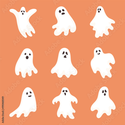 Flat modern ghosts collection. Cute ghosts characters, spooky cartoon Halloween ghosts set