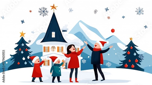 Flat of a group of people singing Christmas carols in front of decorated houses with snow creating a festive holiday spirit in the neighborhood