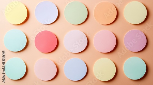 Flat pastel round sticker set arranged over warm colored background with soft shadows creating a vibrant and inviting aesthetic