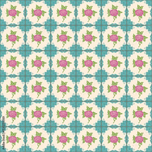Flat Pastel Teal Color Nyonya Floral Tile Seamless Pattern