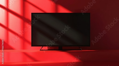 Flat screen TV with subscription notification and dramatic shadows against a vibrant red background for modern media advertising