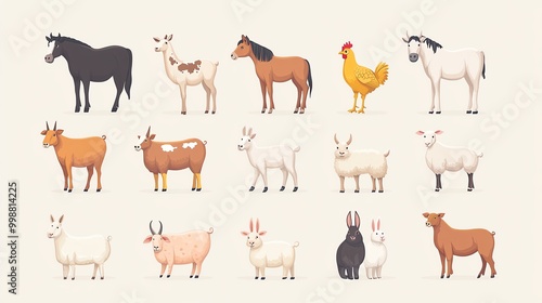 Flat set of farm animals including a horse, cow, pig, sheep, goat, chickens, rabbits, and a shepherd dog, Farm Animals Set, Rural domestic livestock