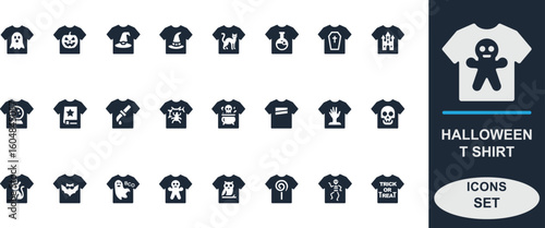 Flat solid Halloween T-shirt icon bundle with ghost, pumpkin, witch hat, bat, skull, cat, cauldron, mummy, broom & 'Trick or Treat' text; perfect for print, merch, and web use.