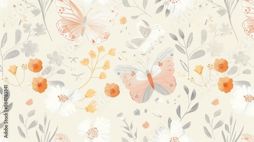 Flat style illustration: charming floral and butterfly pattern on cream background with pink, orange, and gray tones, background, wallpaper