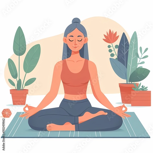 Flat Style Illustration of a Woman Practicing Meditation on a Mat, White Background