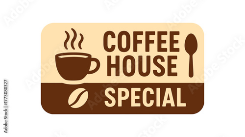Flat vector banner design text COFFEE HOUSE SPECIAL supporting icons of cup bean and spoon brown and ivory tones