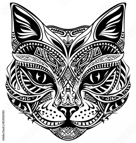 Flat vector black and white line art illustration of a highly detailed cat's face with a traditional Polynesian pattern