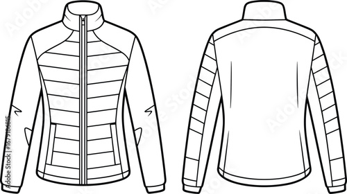 Flat vector CAD technical drawing of padded winter jacket front and back view, quilted coat fashion sketch template illustration