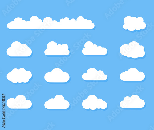 Flat Vector Cloud Set Minimal white cartoon shape with shadow on blue sky background