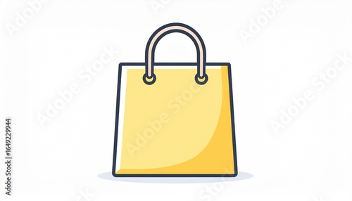 "Flat vector icon of shopping bag, pastel yellow fill, thin clean outline, soft drop shadow, white background"