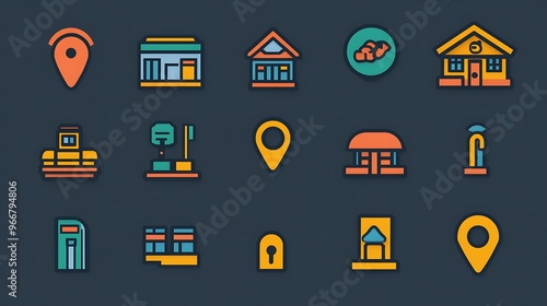 Flat vector icon set for a navigation app, featuring icons for different types of locations like restaurants, gas stations, and ATMs in a clear and informative style.
