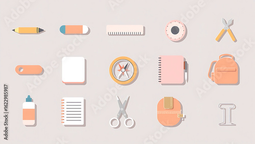 Flat vector icon set of essential school and office supplies. Stationery collection for back to school and creative work.