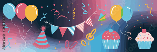 Flat vector icon sheet of party items with a gradient background – Great for digital invitations, holiday graphics, or festive promotions.