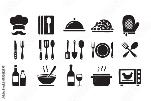 Flat vector icons of food and chef elements for kitchen and dining themes