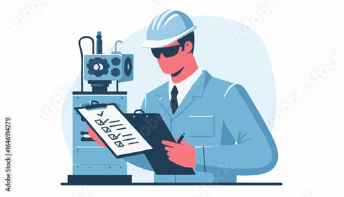 Flat Vector Illustration - A quality assurance engineer inspecting machinery or products with a checklist, no visible face, minimalist style, isolated on white background