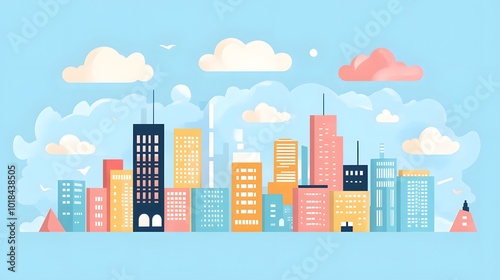 Flat vector illustration of a city skyline, with simple flat shapes, a light blue background, and sky and clouds in the background