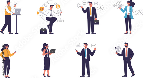 Flat vector illustration of business people working, presenting, analyzing data, communication, leadership, and teamwork for corporate office success
