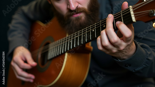 Flat Vector Illustration of Hipster Bearded Man Skillfully Playing Guitar - Artistic Expression