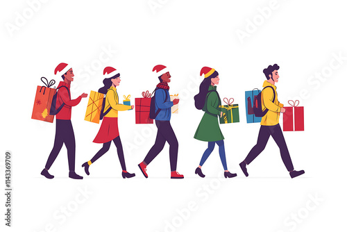 Flat vector illustration of mail carriers delivering Christmas packages on time, carrying shopping bags and gifts, capturing the festive spirit and reliable service