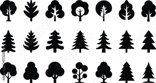 Flat vector silhouette set of stylized tree icons with diverse shapes, foliage patterns, forest elements, nature design, botanical illustration