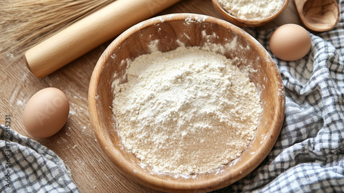 Flatlay of baking essentials with flour, rolling pin, and dough on a clean surface, capturing the preparation process and rustic charm of homemade baking.
