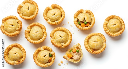 Flatlay of mini turkey pot pies in pastry cups on white background for thanksgiving celebration