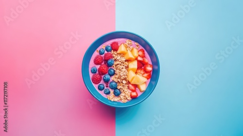 Flat-lay of vibrant smoothie bowls with tropical fruits and granola, placed on a bright surface with room for copy.