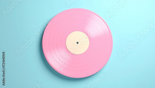 Flat-lay Pastel pink vinyl record with a cream center, isolated on a baby blue backdrop, creating a soft, dreamy aesthetic