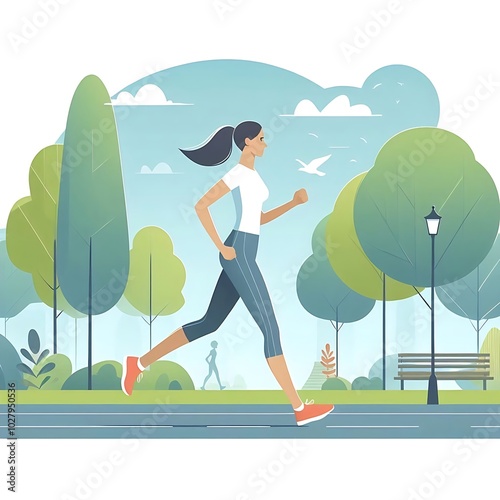 Flat-style illustration of a woman jogging through a park. Ideal for fitness, outdoor, and healthy lifestyle-themed designs. Simple and energetic composition, perfect for promoting physical activity