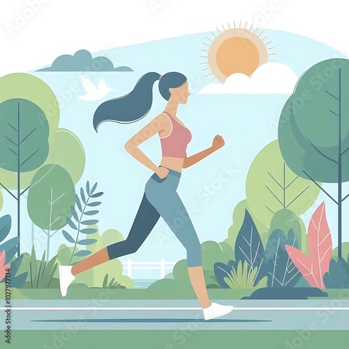 Flat-style illustration of a woman jogging through a park. Ideal for fitness, outdoor, and healthy lifestyle-themed designs. Simple and energetic composition, perfect for promoting physical activity