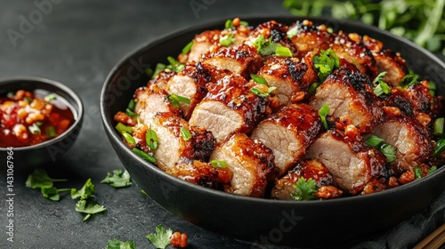 Flavorful bowl of peking-style crispy pork in rich sauce ready to be served with fresh ingredients for a delicious meal
