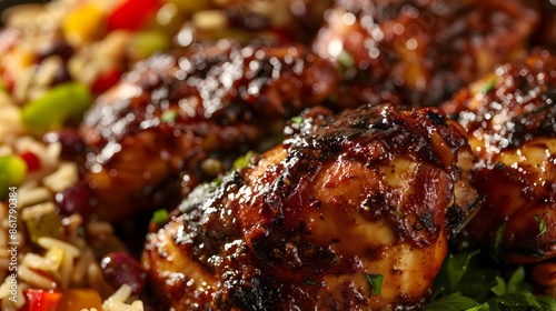 Flavorful Jamaican Jerk Chicken Meal with Vibrant Caribbean Carnival Backdrop